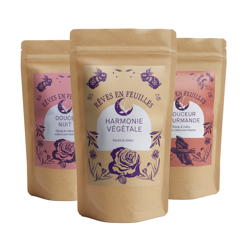 - Douce Nuit : Rooibos (70 %), camomille (10 %), verveine (10 %), lavande (10 %)